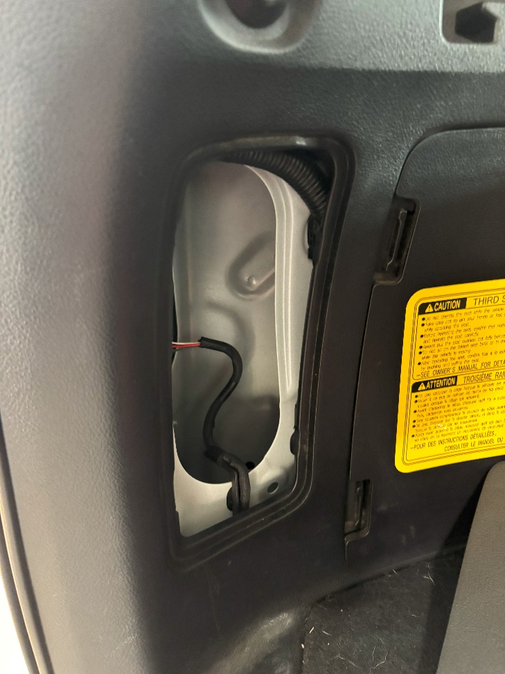 Route the new tail light harness through the opening shown. Align the mounting posts with the vehicle’s mounting points and press the tail light into place until the retention clips engage. Secure the tail light using the two 10mm nuts removed earlier. Repeat on the other side.