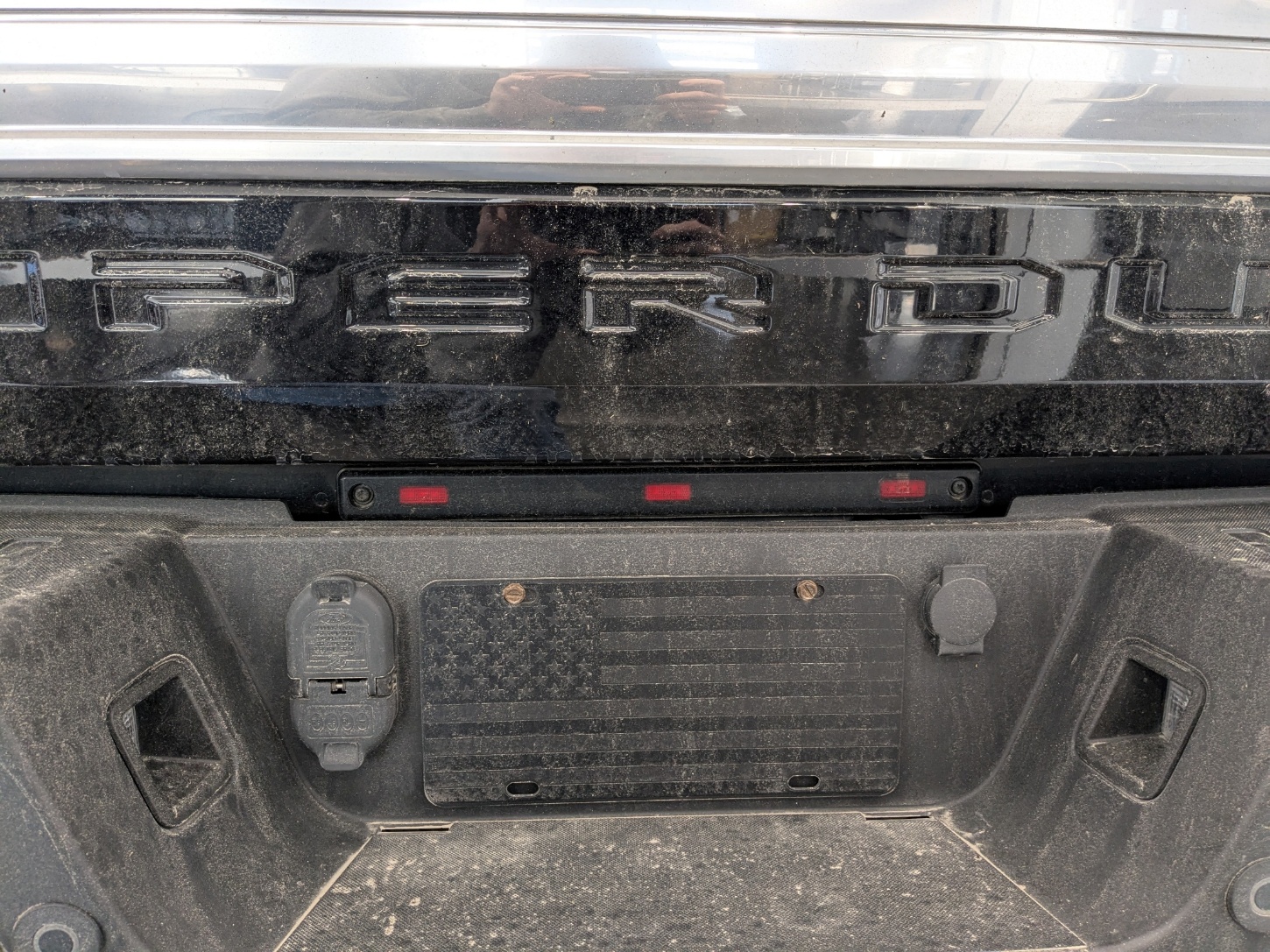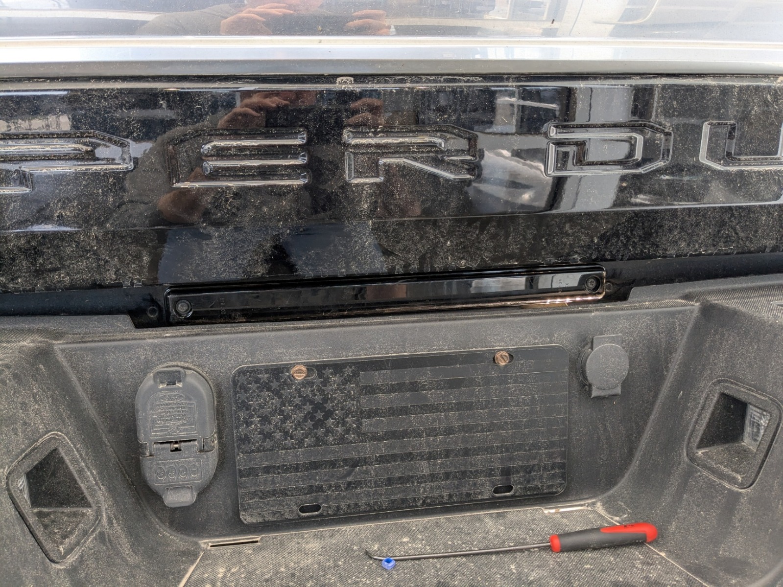 Remove the two T30 Torx screws securing the factory center marker light, then pull the light away from the tailgate.