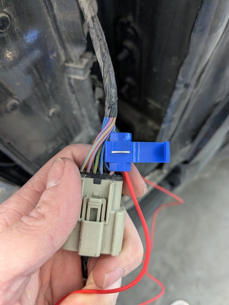 Unplug the taillight connector. Identify the brake light wire/pin (on the example truck shown, it was pin 2), then use the supplied T-Tap to connect the red wire to the brake light wire.