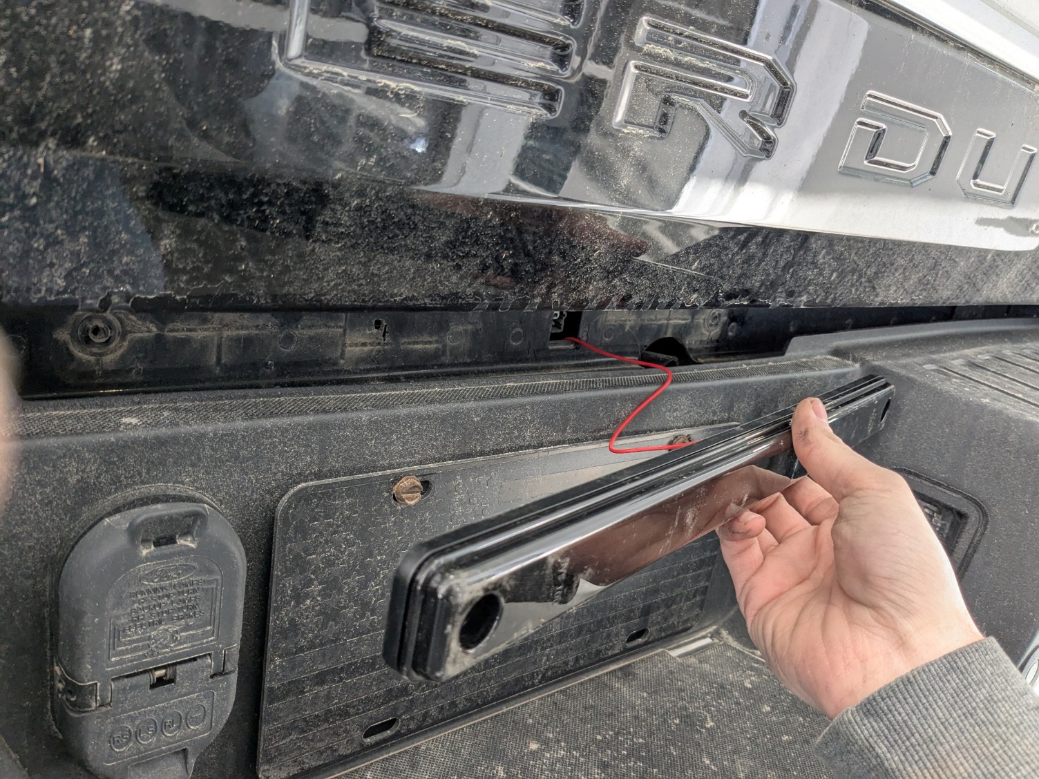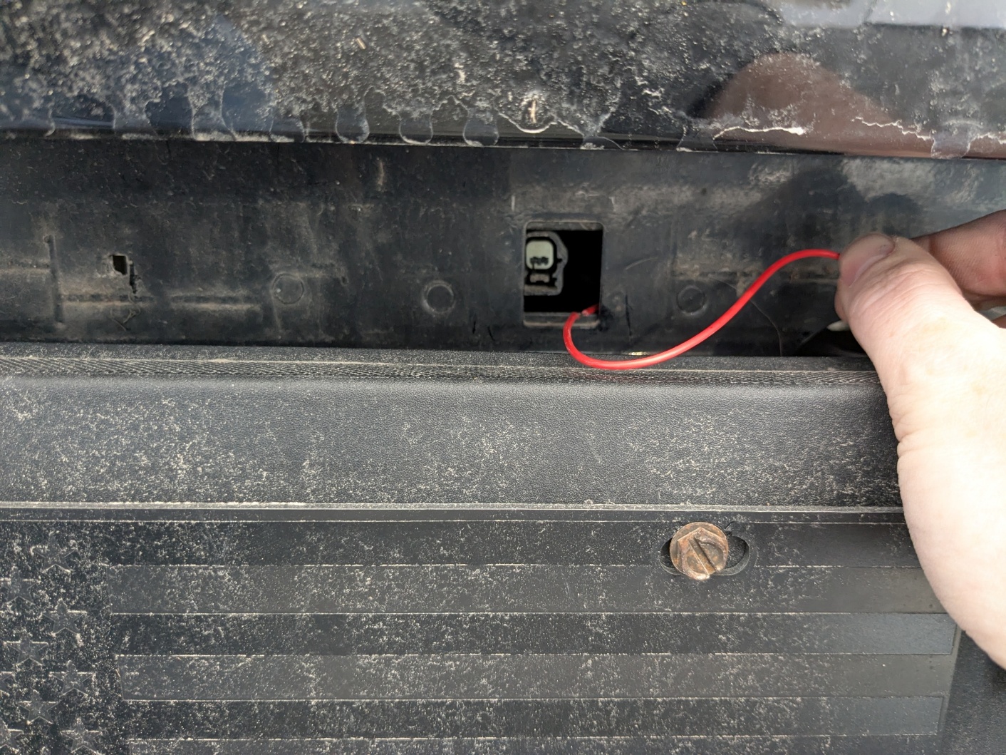 Set the factory marker light aside. Route the red wire from the new center marker light through the opening in the tailgate.