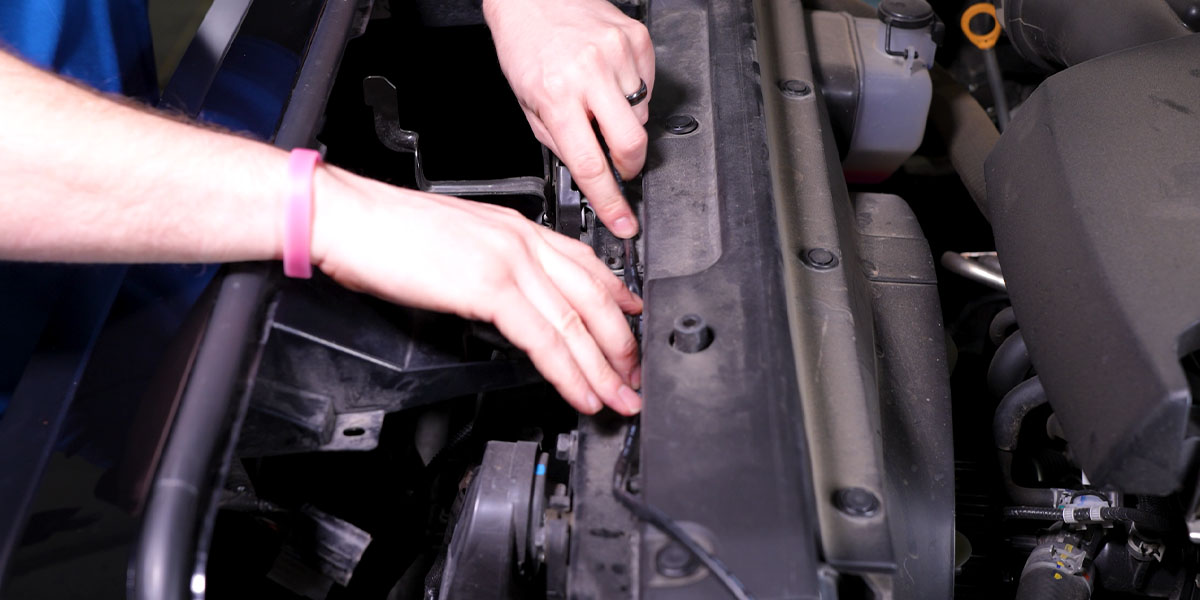 Next, use a pair of pliers to squeeze the two tabs holding the sensor connector at the top of the grille and disconnect the wiring harness. Once disconnected, remove the grille from the vehicle.
