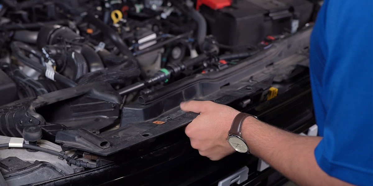 Begin the installation by opening the hood. Then, use a plastic trim removal tool to remove the nine clips (circled in red) from the top of the grille.